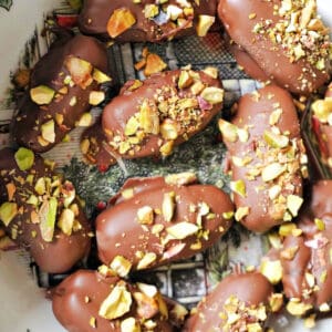 Chocolate-Covered Almond-Stuffed Dates, an elegant, yet effortless edible gift for the festive season, when time is short, yet presentation matters. It's a fantastic last-minute, no-bake sweet treat that goes wonderfully well with the whole family. Dates stuffed with almond butter, enrobed in a silky milk chocolate and garnished with chopped pistachios, so indulgent!