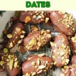 - Arrange the dates onto a plate or tray lined with non-stick paper, and garnish with chopped pistachios.