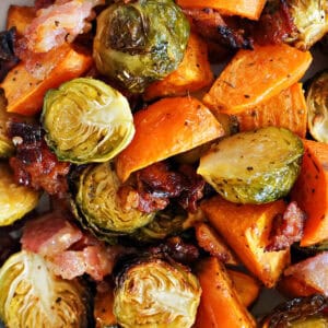 Maple Roasted Brussel Sprouts with Bacon and Sweet Potatoes